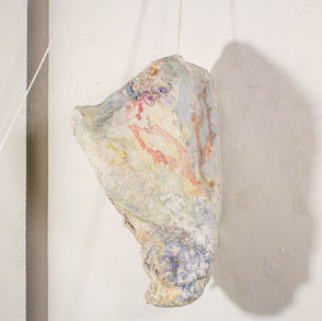 plaster, wire, acrylic, crayon, colored pencil, water-soluble ink, pin, thread